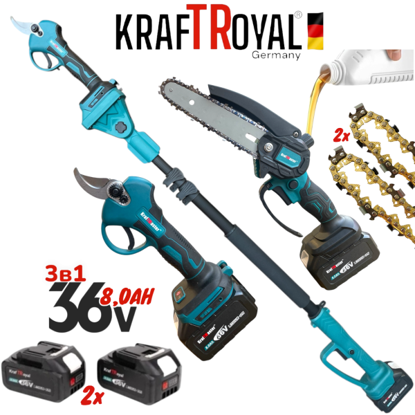 95.83 лв. (49.00 €)Телескопичен Прът Акумулаторна Лозарска Ножица и Резачка за Клони Трион с Автоматично Омасляване 36V 8AH KRAFTROYAL Безчетков Комплект 3в1