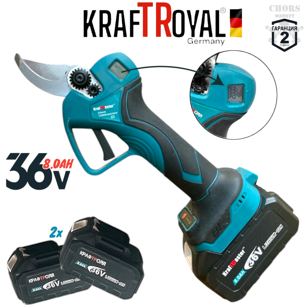 48.89 лв. (25.00 €)Акумулаторна Безчеткова Ножица Лозарска 36V 8AH KRAFTROYAL 2 Батерии с Дисплей за Индикация + Допълнителен Нож