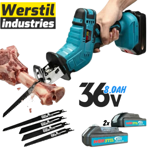 Мини Саблен Трион Акумулаторен 36V 8,0AH WERSTIL Безжичен Прав Трион за Месо Кости Метал Дърво Пластмаса Желязо с 4 Ножа 2 Батерии