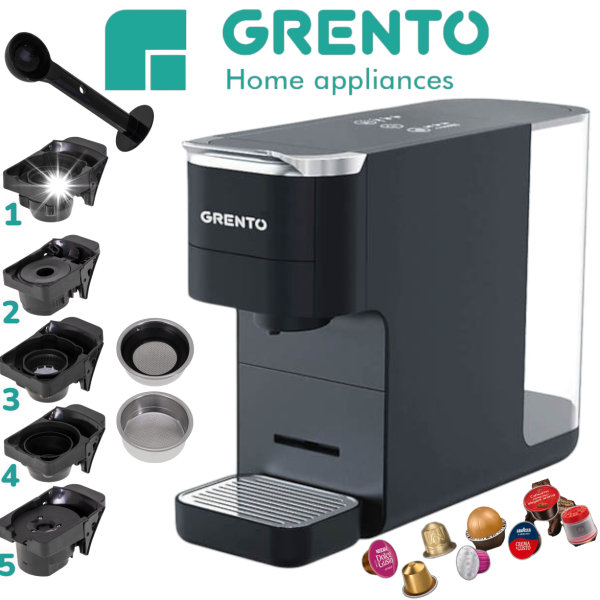 Кафемашина с Капсули и Еспресо GRENTO 5 Адаптора 1.5 литра 20 бара Универсална Машина за Кафе