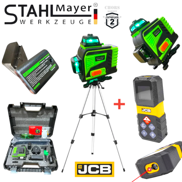 Лазерен Нивелир 4Д с Тринога Професионален STAHLMAYER + Професионална Лазерна Ролетка Професионална JCB 30 метра ПРОМО КОМПЛЕКТ