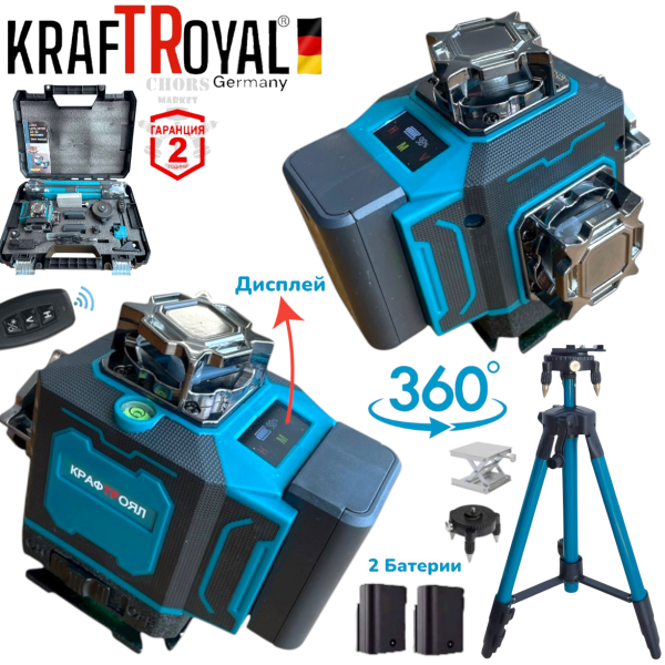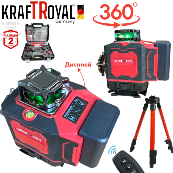 4Д Нивелир Лазерен 4D KRAFTROYAL 360 градуса с 16 линии зелен лазер с Тринога и Дисплей 2 Батерии