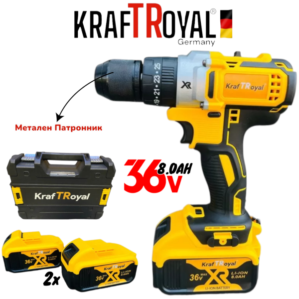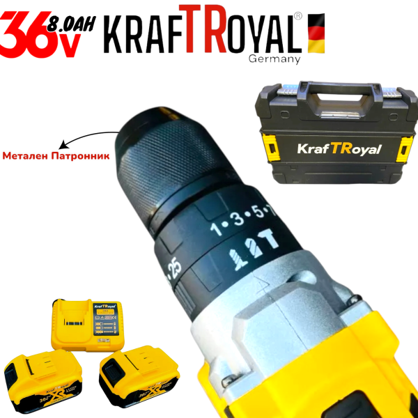 Акумулаторен Винтоверт 36V 8,0AH Ударна Безчеткова Бормашина Безжична KRAFTROYAL