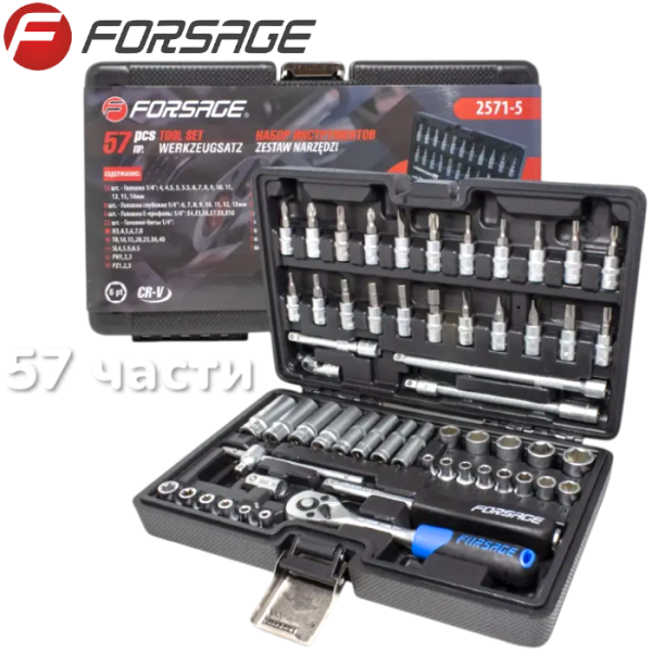 Гедоре Шестостенно 57 части 1/4 4-14мм FORSAGE Комплект Гедоре Тресчотка