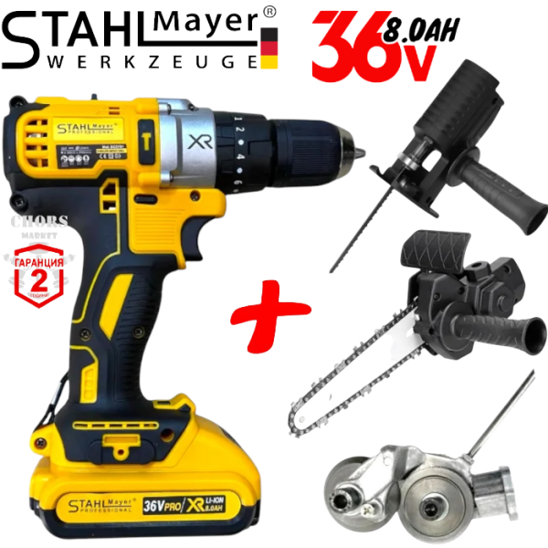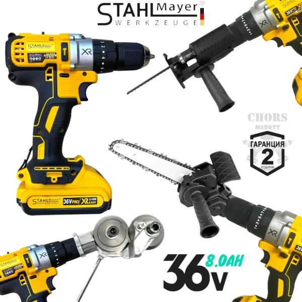 Акумулаторен Безчетков Винтоверт Бормашина 36V 8,0AH STAHLMAYER + Приставка Адаптер Зеге Трион + Приставка за Рязане на Ламарина и Метал + Приставка Резачка Трион за Клони 18см шина 2 батерии