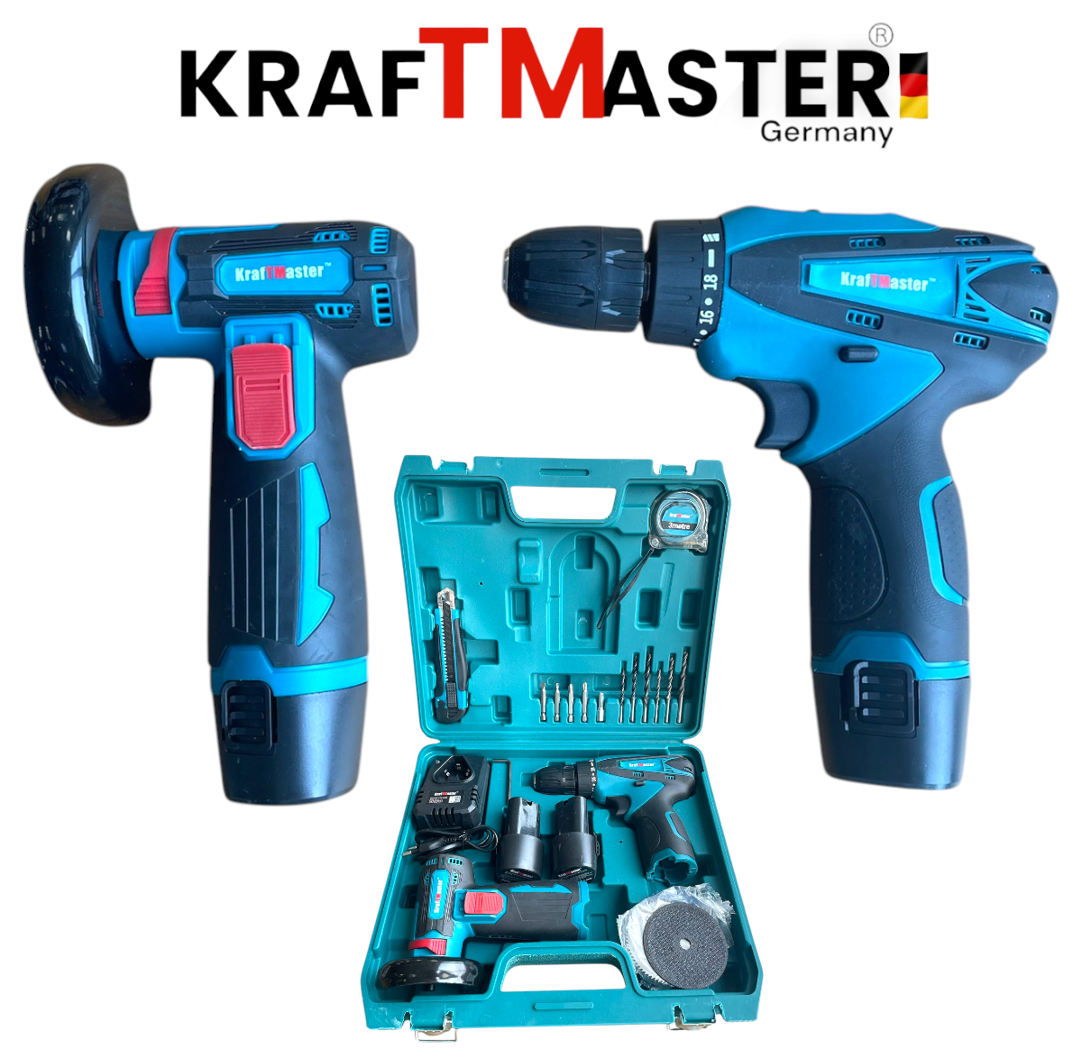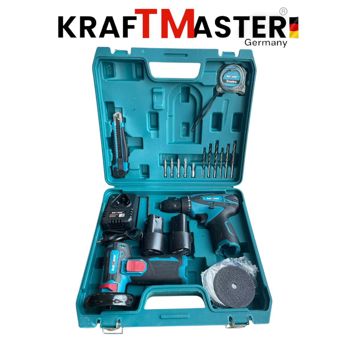 Акумулаторен Ъглошлайф 76мм и Двускоростен Винтоверт KRAFT MASTER 24V 6AH + 2 Броя батерии и Зарядно Накрайници и Дискове
