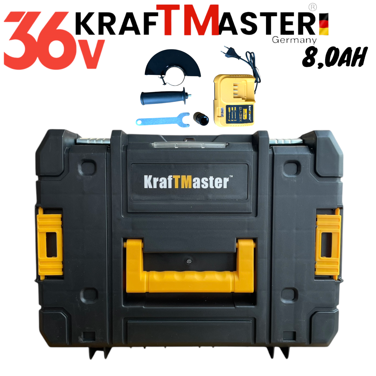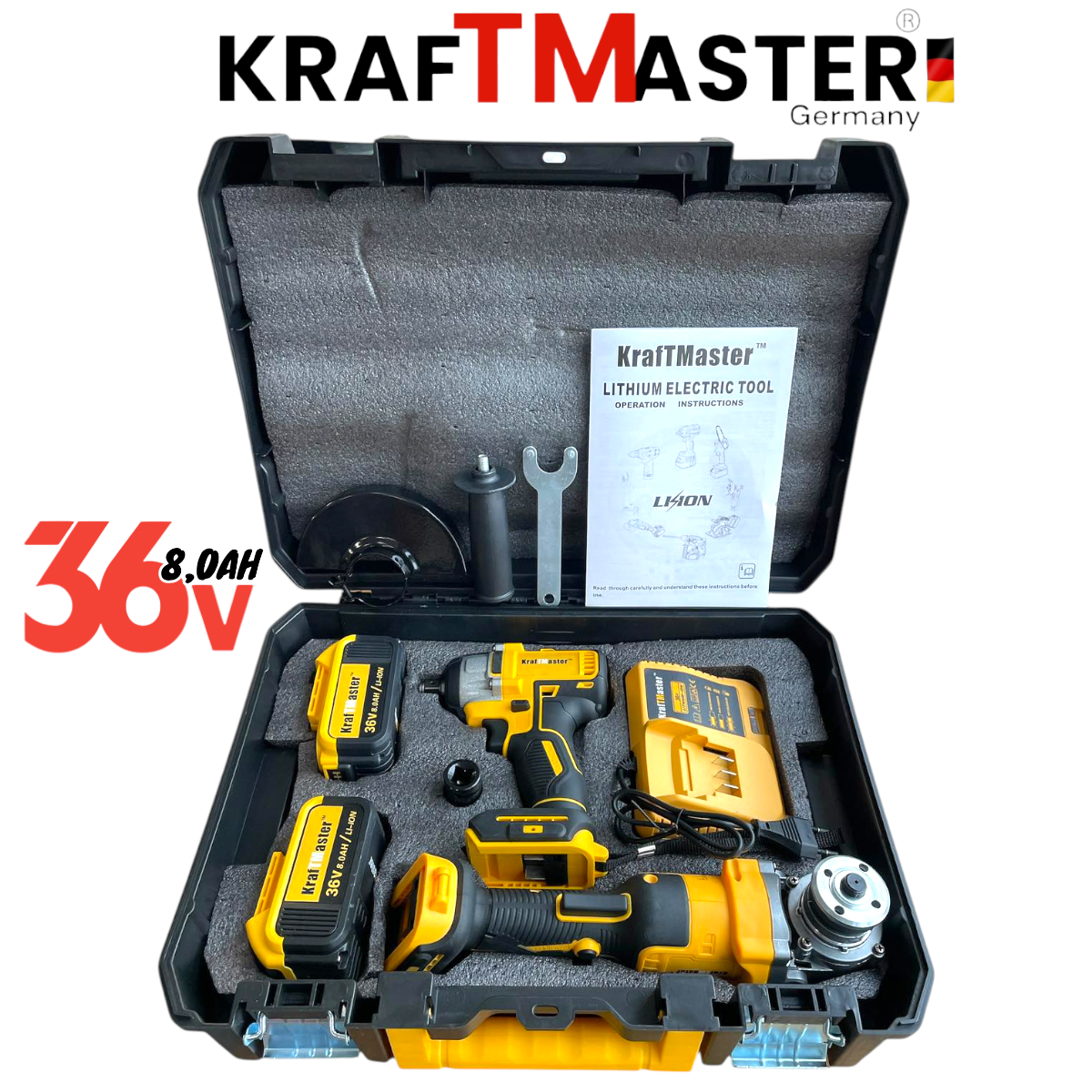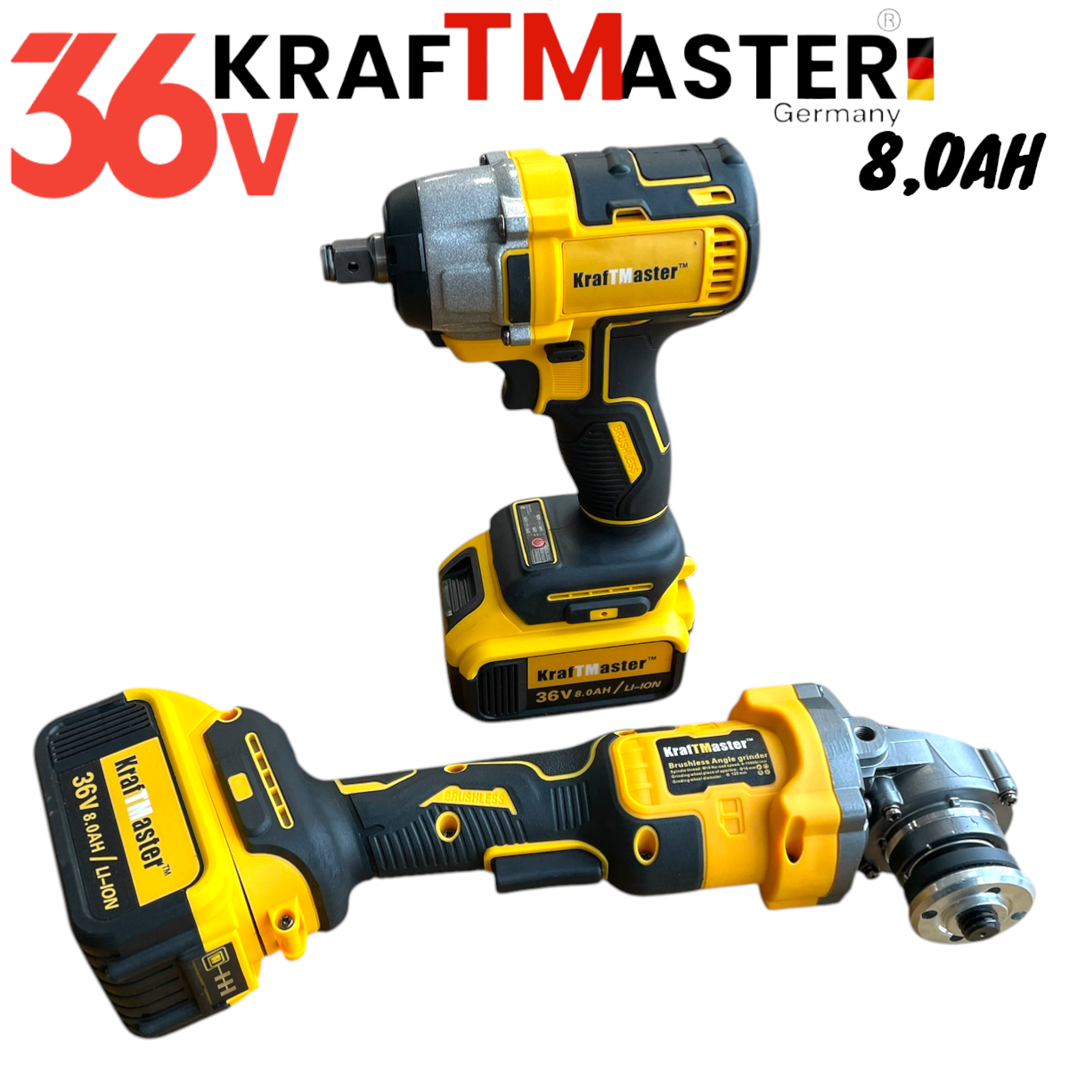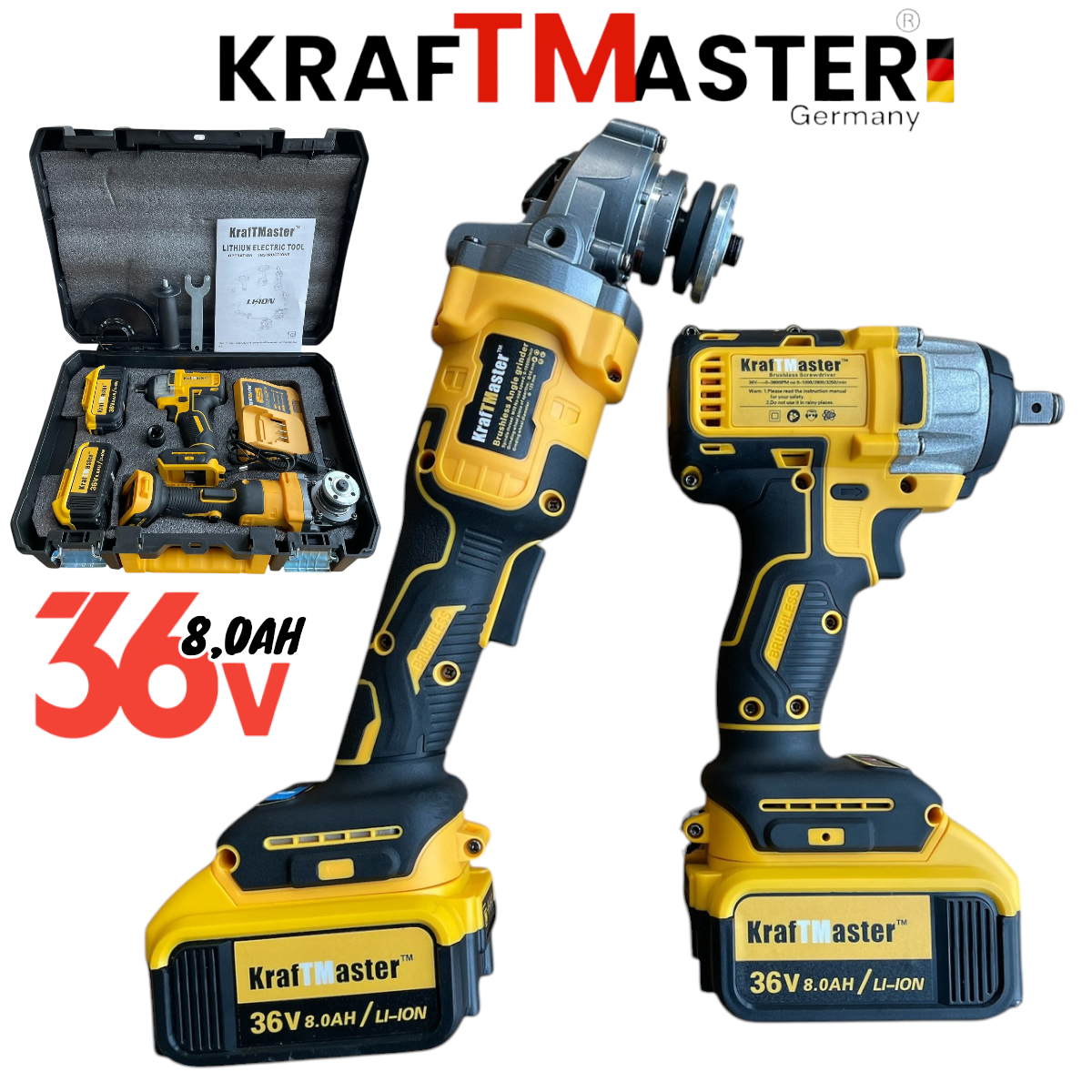 2в1 Комплект Акумулаторен Винтоверт и Ъглошлайф 36V 8,0Ah KRAFTROYAL Безчетков Ударен 2 батерии