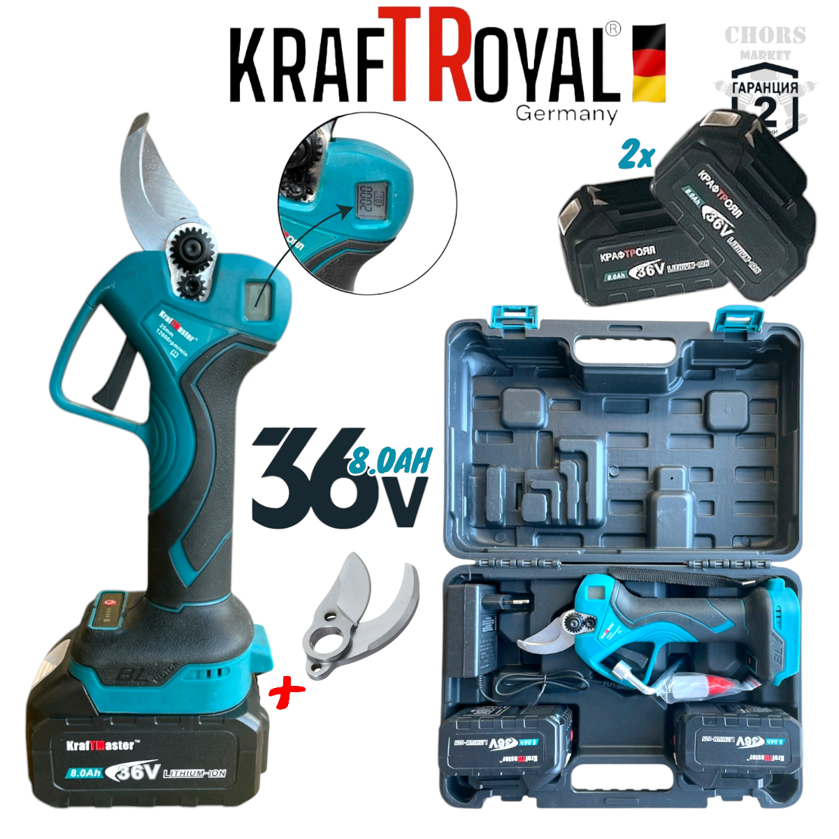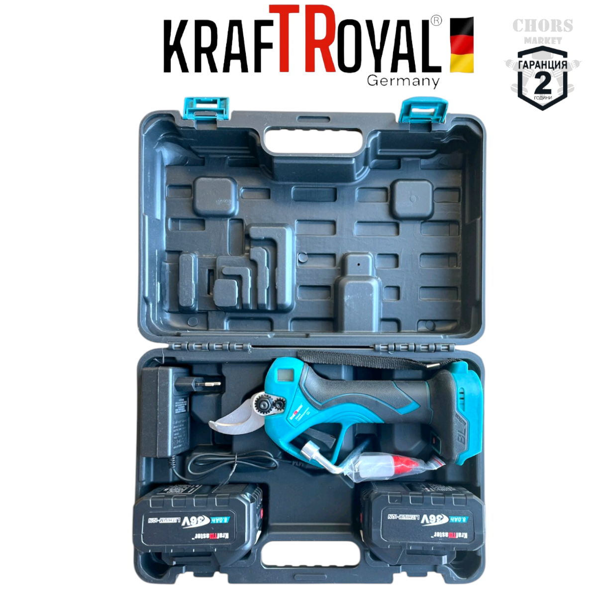 Лозарска Ножица Акумулаторна Градинска с Дисплей 36V 8AH KRAFTROYAL 2 Батерии и Зарядно + Резервен Нож
