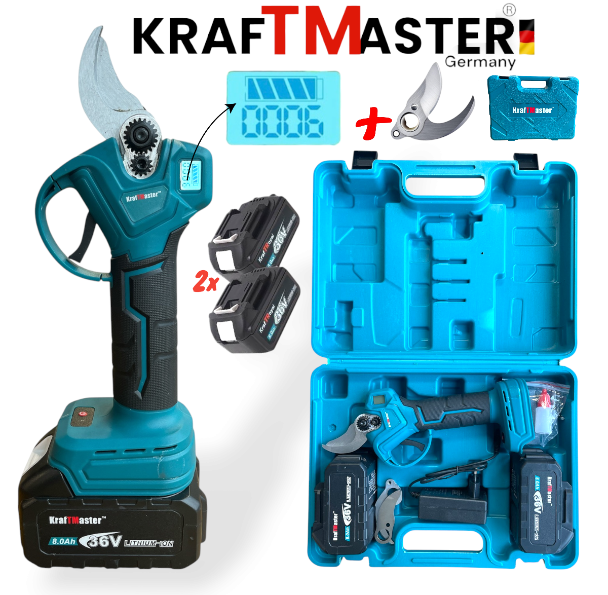 АКУМУЛАТОРНА ЛОЗАРСКА НОЖИЦА KRAFTMASTER 33мм + Подарък Резервен Нож 36V 8,0AH 2 Батерии Зарядно