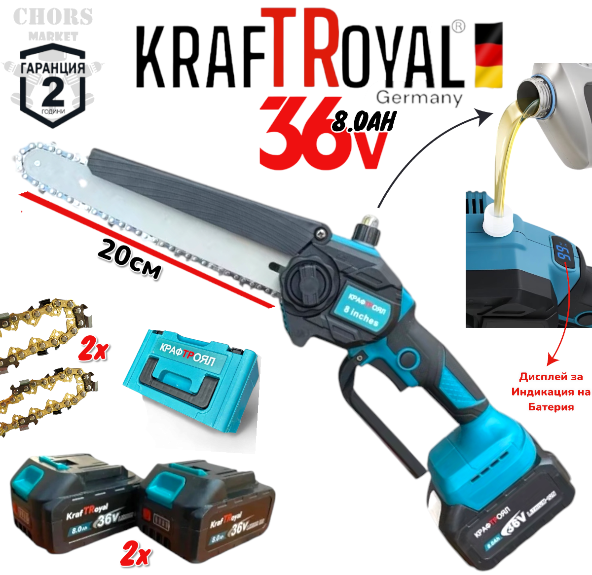 Акумулаторна Резачка – Трион с Автоматично Смазване на веригата. KRAFTROYAL 36V 8AH с шина 20 см и 2 Вериги 2 Батерии