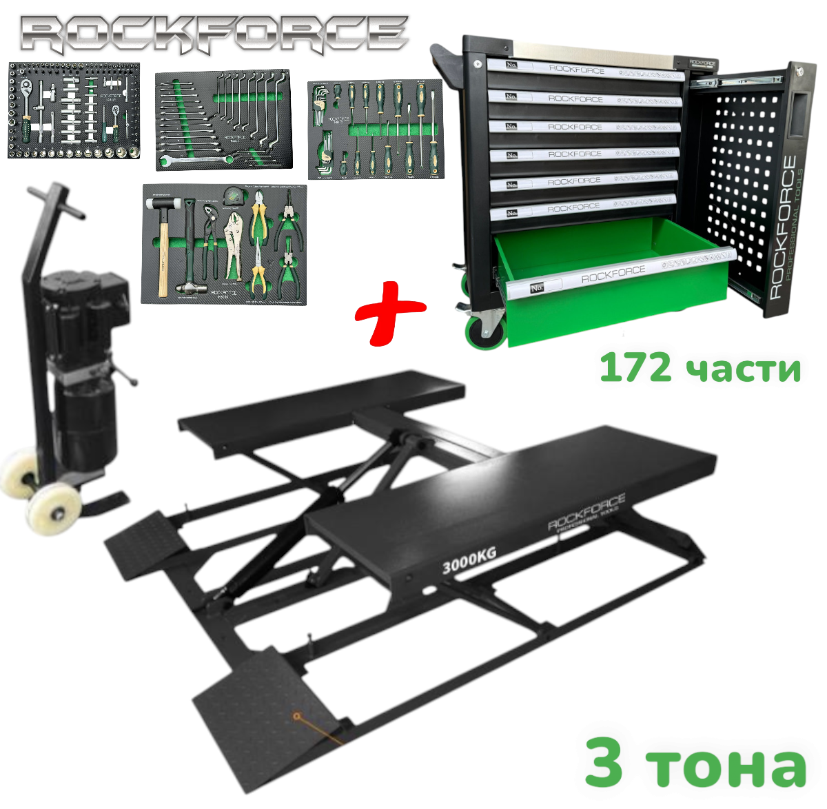 ПРОМО КОМПЛЕКТ Професионален Монофазен Подемник 3 тона H30M и Професионален Шкаф за Инструменти 7 чекмеджета 4 пълни 172 части ROCKFORCE