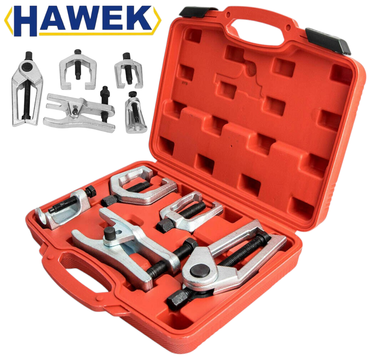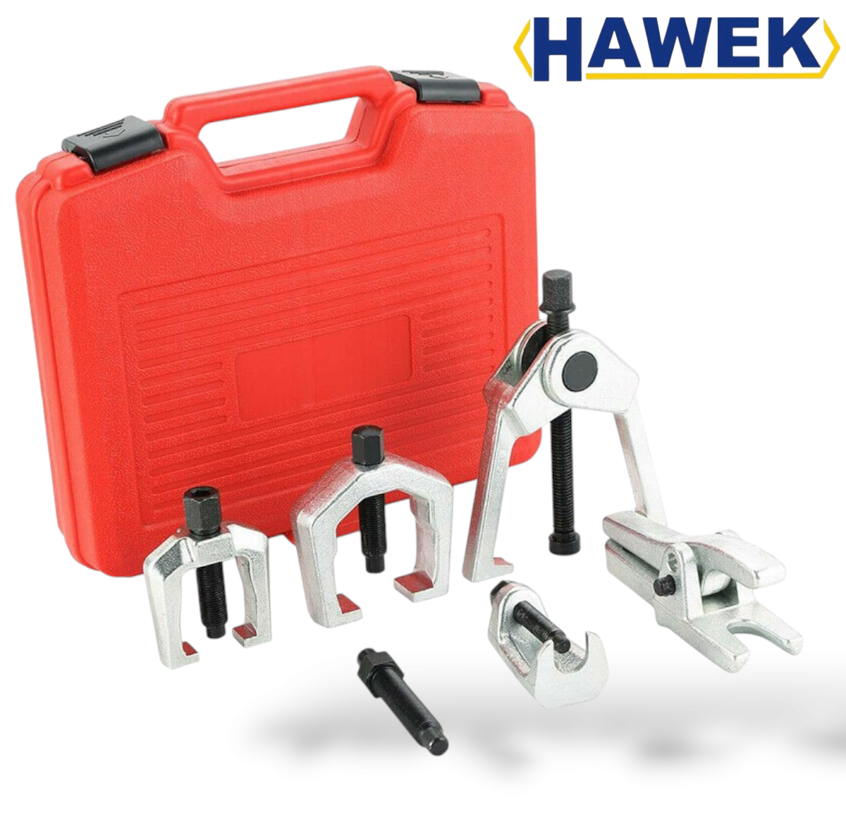Този сервизен комплект от 5 части е чудесно решение за поддръжка на вашият автомобил. Комплектът позволява монтаж и демонтаж на най-разпространените размери напречни щанги, шарнири, вътрешни лагери, рамена Pitman – поддръжка на почти всички видове превозни средства. Разделителят на сферични шарнири тип преса позволява безопасен демонтаж на шарнирите, без да се повредят гумените уплътнения(маншони). Спестете пари, обслужвайки собствения си автомобил – идеален вариант както за професионална, така и за хоби приложения/употреба.