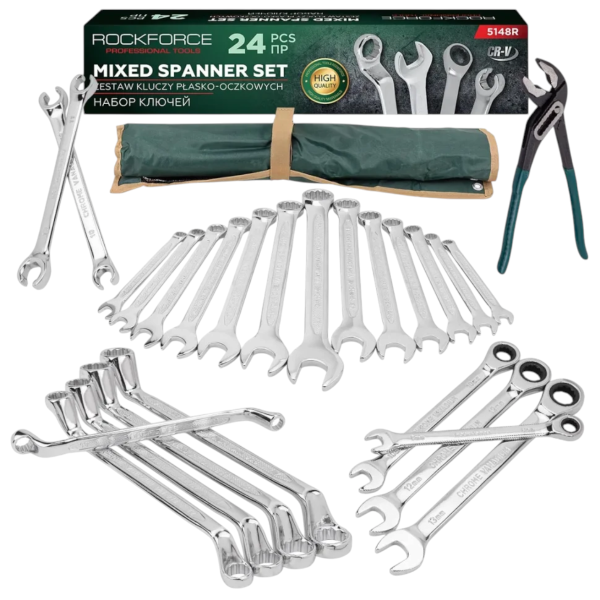 Комплект Микс Професионални Ключове 24 части Срязани Лули Тресчотни Звездогаечни и Клещи Гарги ROCKFORCE RF-5148R